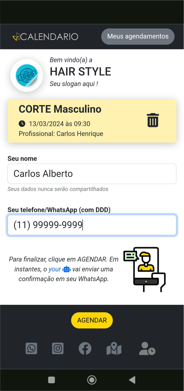 Informando nome e telefone, o agendamento já estará finalizado. Em instantes, uma confirmação será enviada.